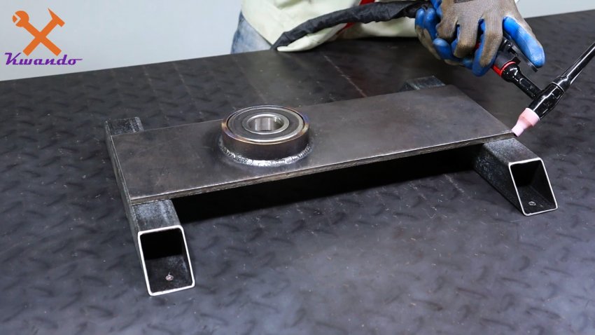 К основанию привариваются поперек две профильные трубы с отверстиями по краям для дальнейшего крепления к столу. Таким образом, диск с валом можно будет установить в запрессованный в кольцо станины подшипник.