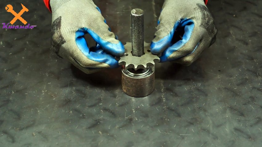 Теперь берем отрезок трубы диаметром 40-50 мм, и запрессовываем в него три подшипника. В них вставляем вал, к которому приваривается звездочка. Эта конструкция выставляется так, чтобы звездочка имела зацеп с роликами на диске.