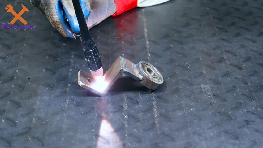 Далее нужно разобраться с толкающим роликом. Для его крепления к станине приваривается два отрезка уголка.