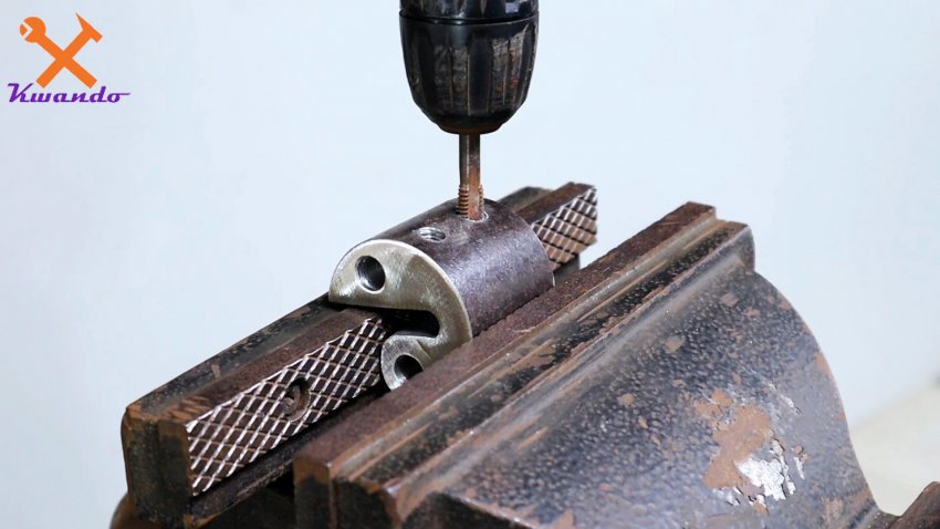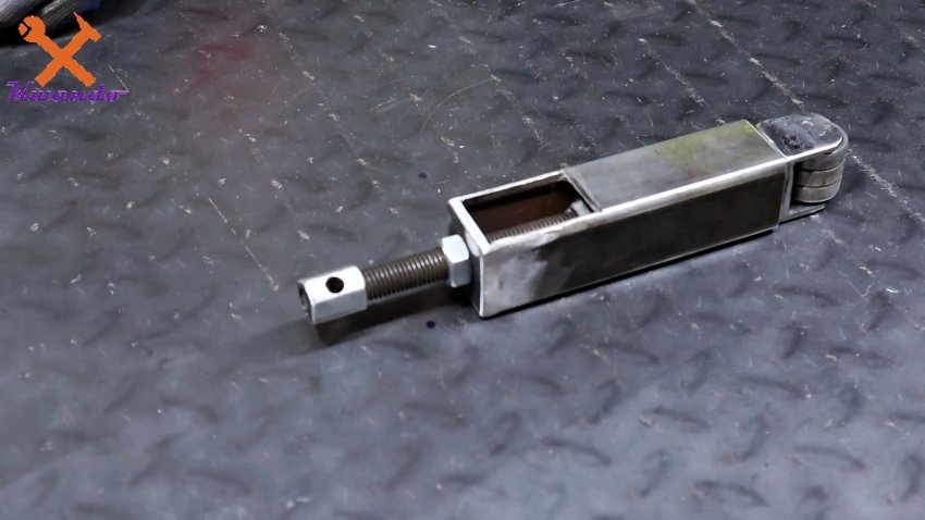 После этого заглушка вваривается в толкатель с роликом. Шпилька с толкателем и роликом помещается в направляющую. На первую накручиваем гайку, и привариваем ее к заглушке направляющей. Теперь при вращении механизма ролик сможет выдвигаться. На краю шпильки делается ручка из удлиненной гайки. Просто накручиваем ее, и сверлим сквозное отверстие. Затем в него вставляем ручку.