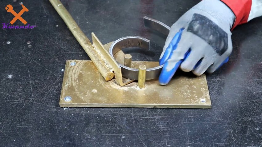 В результате станком можно сначала гнуть полосу, вставляя ее в захват. Чтобы она не выпадала, поджимаем шпильки.