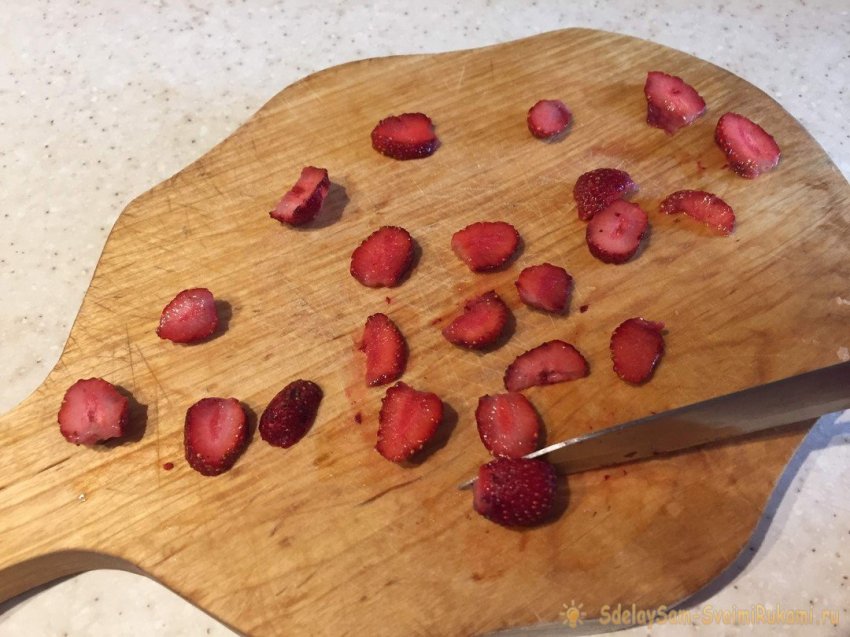 2. Измельчение. Мелкую землянику сушат целиком, а более крупные экземпляры нарезают на тонкие пластинки и выкладывают на покрытый пергаментной бумагой противень.