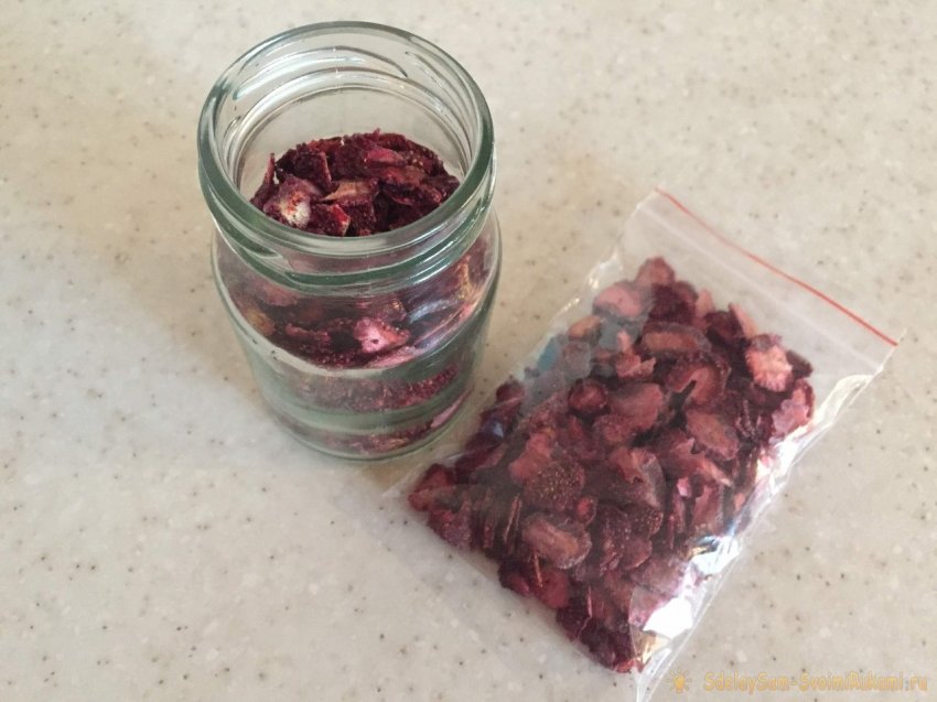 Высушенный продукт после остывания перекладывают в сухие стеклянные банки, которые предохраняют ягоды от чрезмерного высыхания или, наоборот, влаги, а также не дают улетучиться сладкому лесному аромату. Можно также использовать плотные бумажные пакеты.
