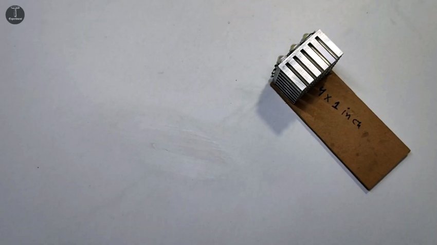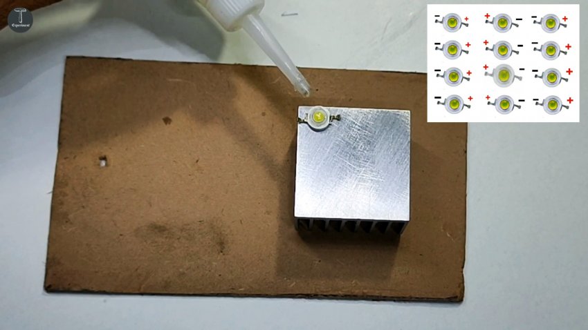 Т.к. светодиоды при работе выделяют тепло, разместить их следует на теплоотводе. Для этого отлично подойдёт ребристый алюминиевый радиатор. Они приклеиваются к нему для фиксации. Ещё лучше, если при этом будет использоваться теплопроводящая паста.