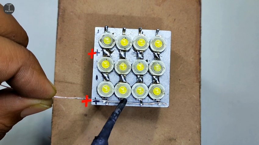 Светодиоды распаиваются по определенной схеме – плюсами к плюсам, минусами к минусам. Т.е. соединяются параллельно.
