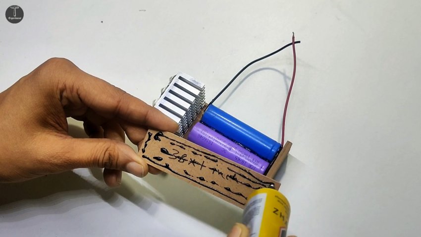 Ток потребляемый светодиодами будет достаточно большим, поэтому в фонарике используется два элемента питания, соединённых параллельно. Они также приклеиваются к основанию. Из кусочков оргалита и клея собирается коробочка. Всё должно быть эстетично.