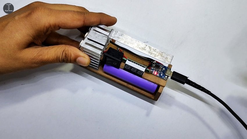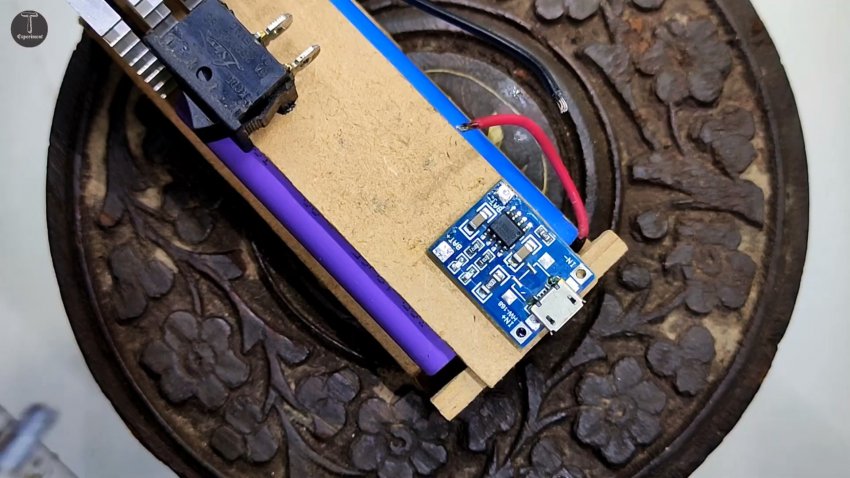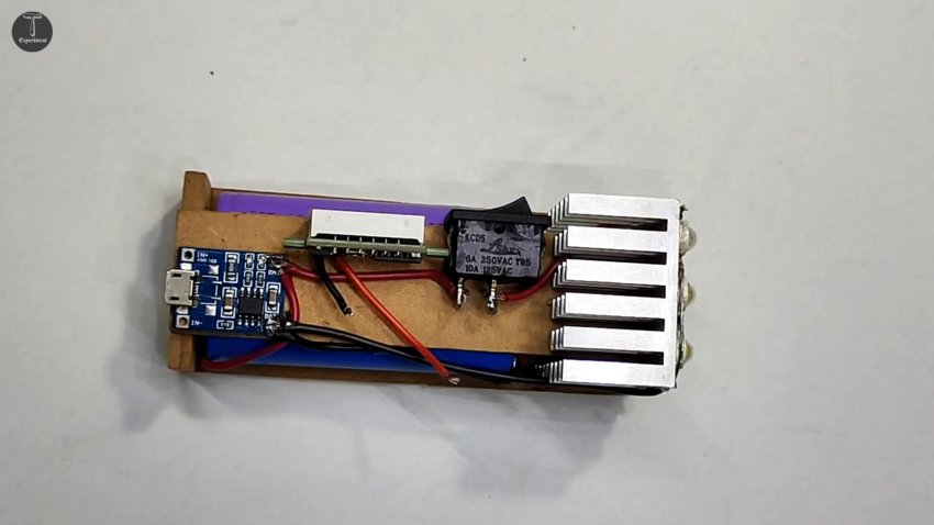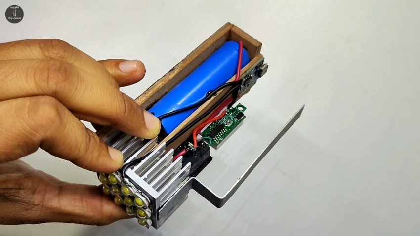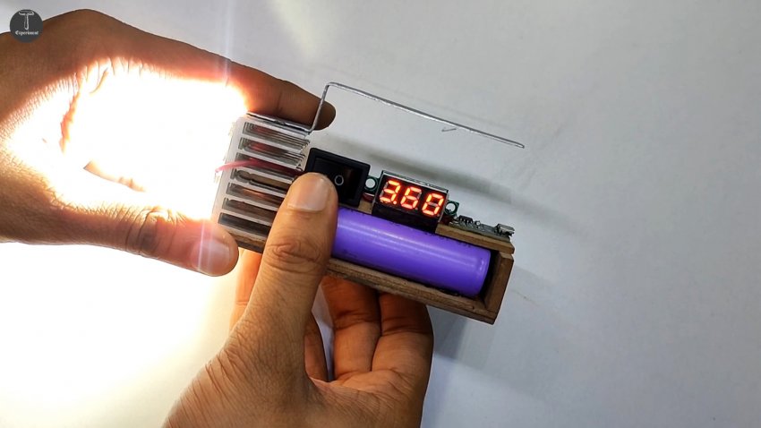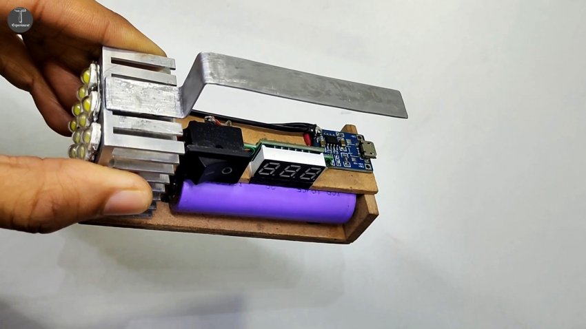 Выключатель питания и зарядный модуль размещаются в корпусе будущего фонарика. Распаивается электронная схема устройства. Дополнительно в фонарике устанавливается электронный вольтметр, для контроля напряжения при работе и заряде аккумуляторов.