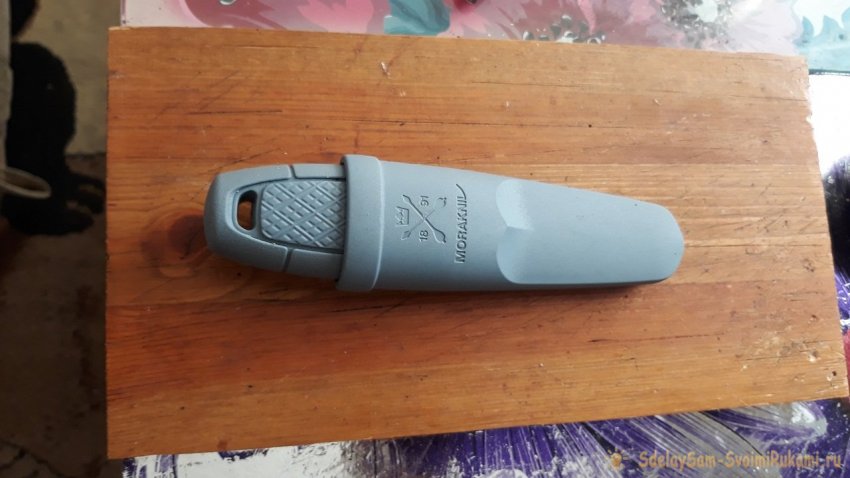 Надеваем на ножны с ножом заготовку, замеряем маркером место, где будет крепиться застежка. Вот такая: