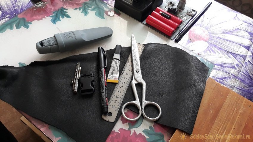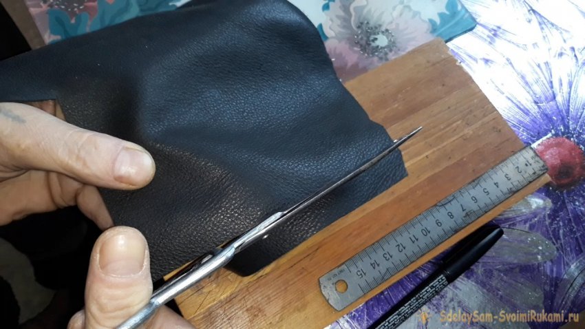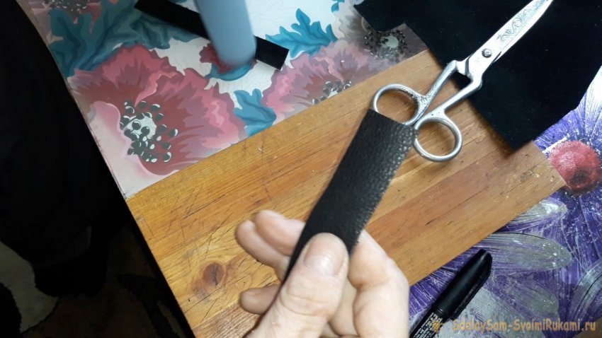 Кусок кожи разместите на ровной поверхности и, отмерив линейкой полоску 1,5 на 15 сантиметров, отрежьте её ножницами.