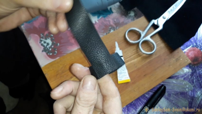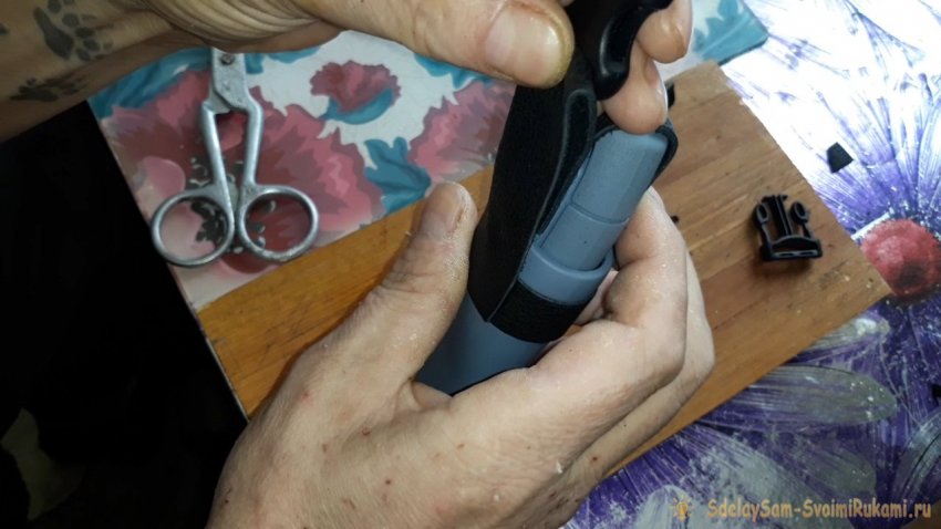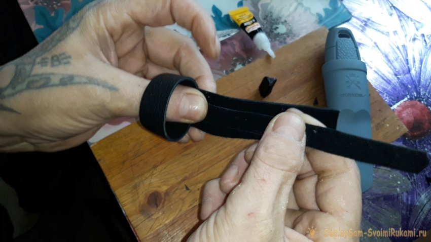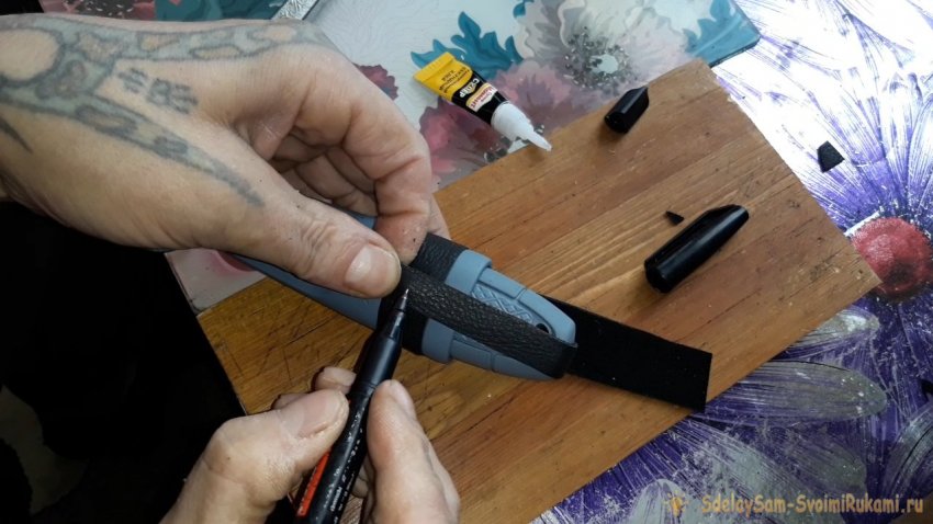Обернув полоску вокруг основания ножен, замерьте маркером место соединения стыков и отрежьте.