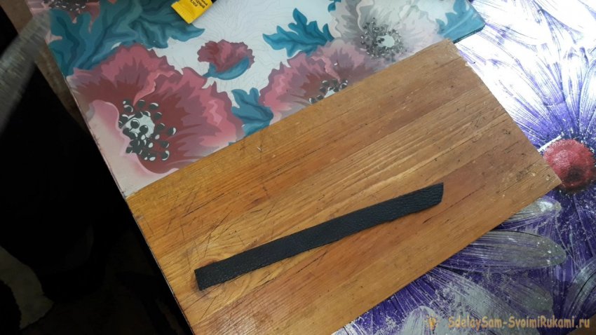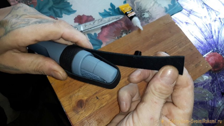 Надеваем заготовку на ножны с ножом, и примеряем тонкую полосу от стыков заготовки на тыловой внутренней стороне, поверх рукояти ножа, до конца полосы на основании ножен.