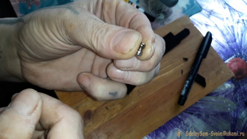 Она на винтовом креплении. Продается в любом магазине бижутерии. Сверлим в отмеченном месте отверстие на 1,5 миллиметра, и закрепляем в нём застежку.