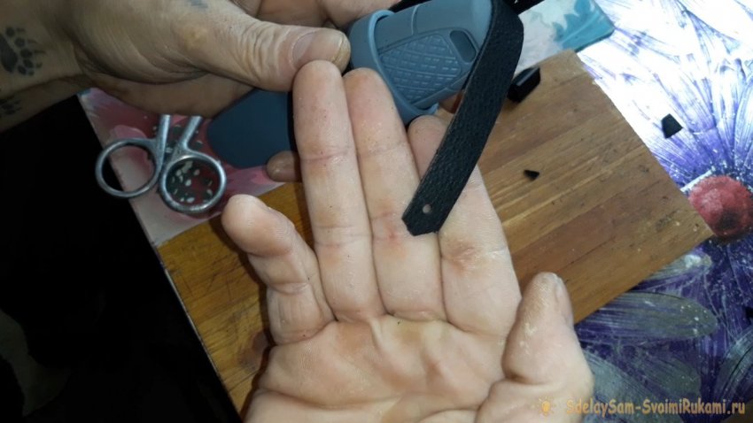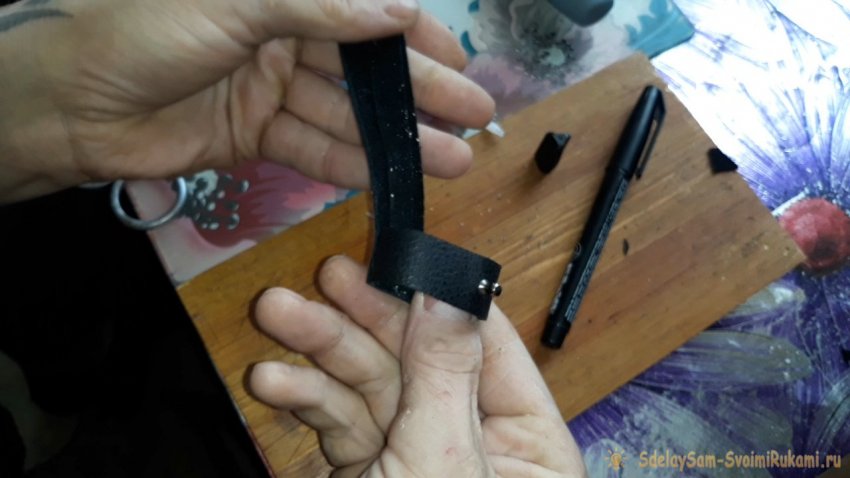 Можно с внутренней стороны застежки приклеить на головку вина кусочек кожи, чтобы он не царапал ножны. Теперь нужно проделать отверстие на ремешке крепления, для застежки. Примеряем ремешок, отмечаем место отверстия, и высверливаем его трубкой подходящего диаметра.