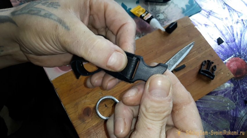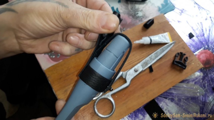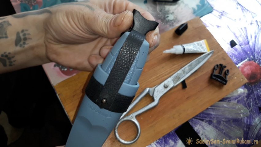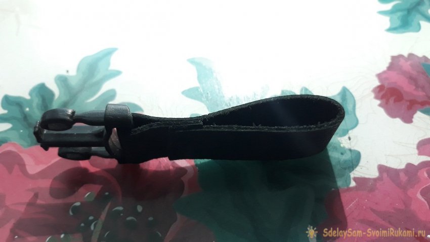 Если отверстие окажется маловато, просто нужно сделать ножом надрез с верхнего края, вглубь ремешка, миллиметра 2. Главное, чтобы оно не оказалось большего диаметра. Далее, нужно приклеить к краю широкой полосы одну из половинок пластмассовой застежки. Такие застежки обычно бывают на ремнях рюкзака. Итак, сгибаем широкую полосу внутрь таким образом, чтобы её сгиб был на уровне конца рукояти. Продеваем в сгиб половину застежки, и приклеиваем конец полосы к его продолжению изнутри. Вот так: