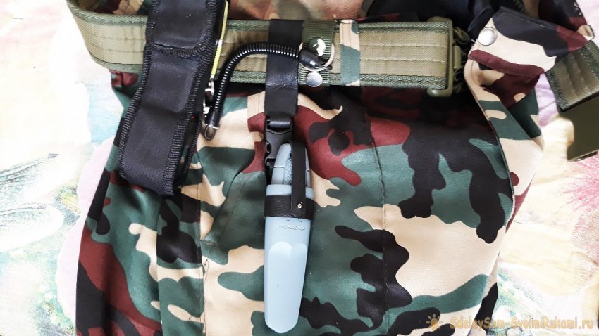 Ничего сложного. Таким образом, мы можем в любое время прицепить или отцепить нож от ремня, не расстёгивая сам ремень.