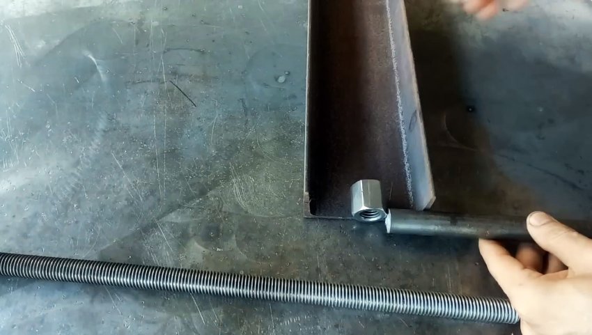 Укладываем удлиненную гайку параллельно полкам по центру перемычки швеллера. Замеряем расстояние от гайки до полки и отрезаем 2 отрезка от круглого прутка такой же длины. Привариваем их к гайке с противоположных сторон.
