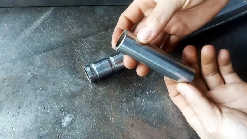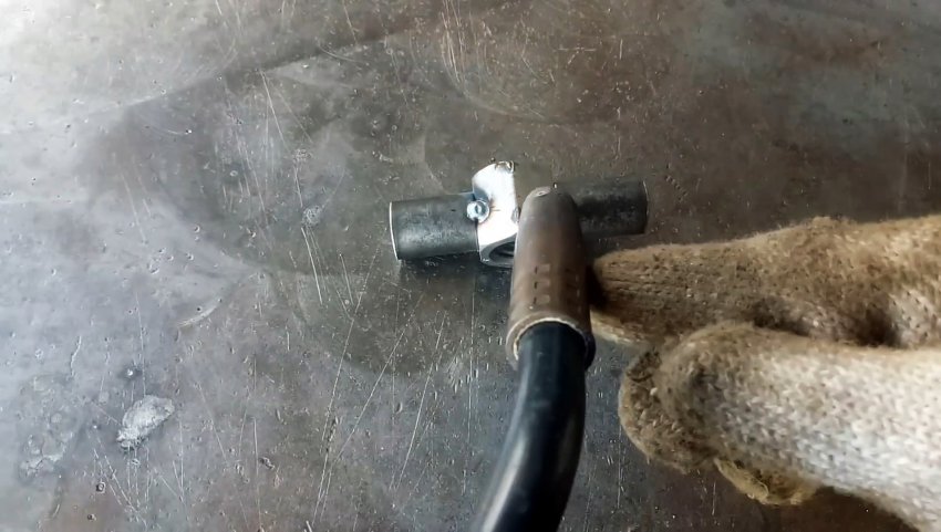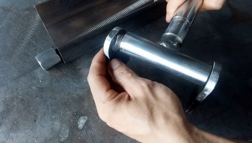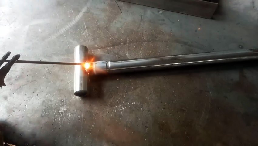 От круглой трубы из нержавейки отрезаем фрагмент длиной, равной высоте швеллера, и привариваем поперечно к концу более длинной трубы так же из нержавейки.