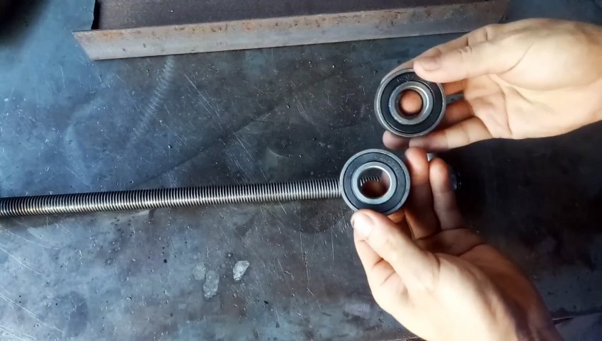 Накручиваем на ходовой винт гайку с приваренными отрезками, на которые надеваем подшипники.