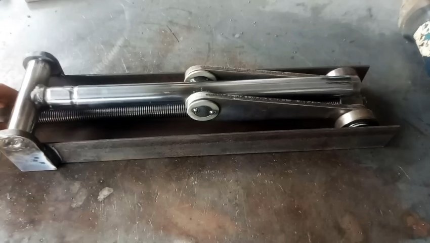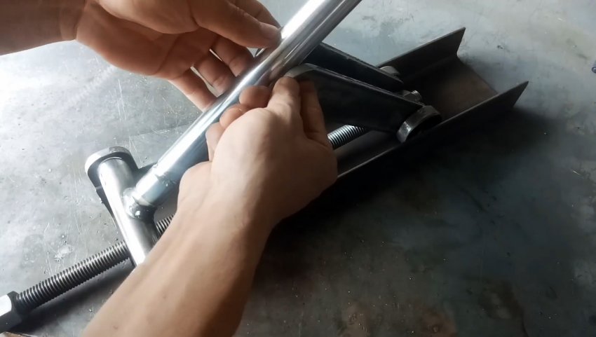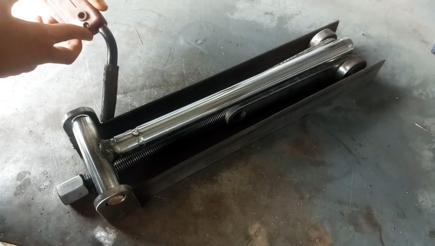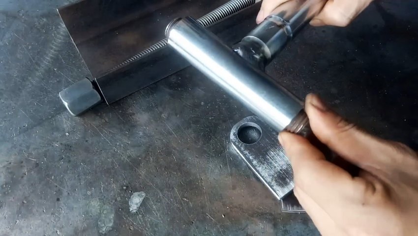 К торцу швеллера с ушками привариваем пластину с отверстием по центру для прохода ходового винта. Теперь при вращении удлиненной гайки-заглушки вправо винт вкручивается в гайку узла с подшипниками и перемещает его по швеллеру в сторону пластины. При этом длинные рычаги приподнимаются и через бобышки поднимают трубу из нержавейки.