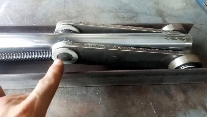 К длинной трубе из нержавейки, расположенной продольно внутри швеллера, привариваем горизонтально с двух сторон бобышки из отрезков круглого прутка, на которые надеваем шайбы и 2 полосы, надетые второй стороной на ось подшипников с шайбами. Наружные шайбы привариваем к бобышкам и оси.