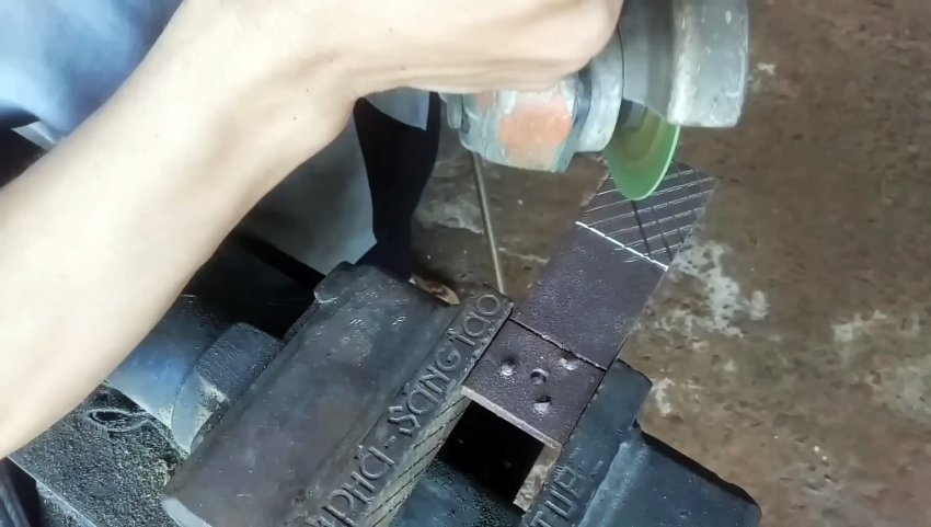 Отрезаем от полосы 2 отрезка длиной по 20 см, которые прихватываем в двух местах сваркой. Сверлим в них с двух сторон отверстия и скругляем углы.