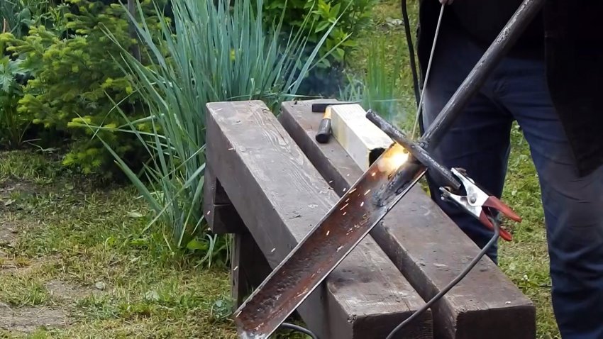 Из трубы диаметром 16 мм вырезаем опору для ноги. Также отрезаем черенок для лопаты и готовим наши детали к сварке. Сначала их соединяем прихватками, затем убедившись, что все получилось правильно, свариваем окончательно.