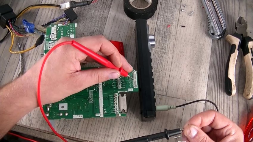 Впрочем, если бы не было подписано, то найти нужные точки для подключения можно очень просто: берем штекер аудиоразъёма, вставляем в «AUX», подключаем панель и при помощи прозвонки начинаем вычислять, где какой контакт. Таким образом находим все необходимые для подключения пины. Соединяем схему устройства.
