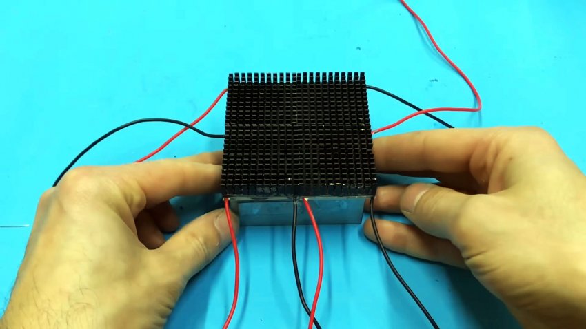 Элементы Пельтье чаще всего имеют форму плоского прямоугольника с двумя выводами. Для нашего зарядного устройства мы возьмём 4 модуля. Разместим их на радиаторе подходящего размера. На нём охлаждающие рёбра расположены таким образом, что в них можно налить воду, и она не выльется.