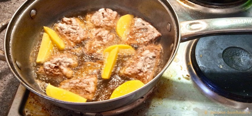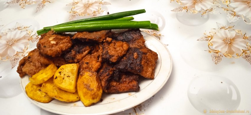 Кусочки тщательно обмазываем в маринаде и оставляем минимум на 30 минут. Чем дольше, тем лучше. Чистим картофель и режем на крупные дольки. На сковороду наливаем масло, разогреваем до нужной температуры. Кусочки рыбы обваливаем в муке и обжариваем с обеих сторон. Сюда же помещаем ломтики картофеля.