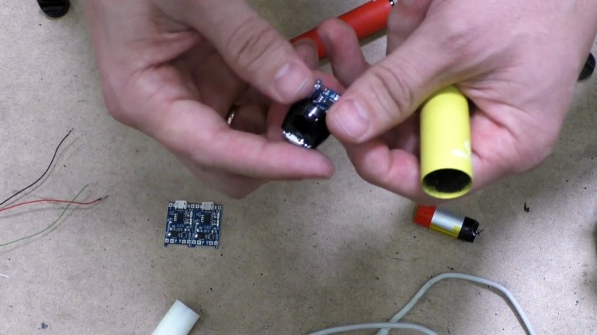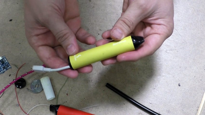 Итак, разбираем корпус. Извлекаем батарею аккуратно. Стараемся не повредить пластиковые мундштук и крышку. Они в дальнейшем также будут использованы в нашем устройстве. Как говорилось выше, в этот корпус войдёт два аккумулятора. Второй извлекаем из такой же сигареты. Общая ёмкость Power Bank будет 2000 мА/час. Батареи мы соединим параллельно.