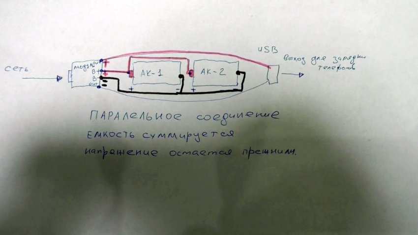 Ничего сложного: аккумуляторы соединяются параллельно, к контроллеру всё подключается согласно рисунку на самой плате. Все точки подключения расписаны: плюс и минус батарей, плюс и минус выхода питания на заряжаемый гаджет. Ошибиться сложно, и всё же, к аккумуляторам провода подпаиваем в последнюю очередь. Клеммы и места пайки изолируем изолентой.