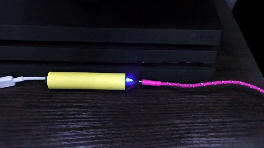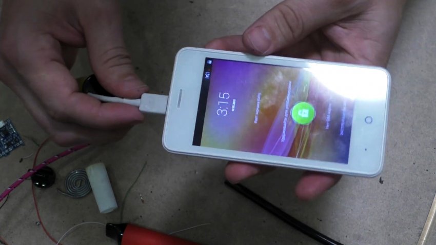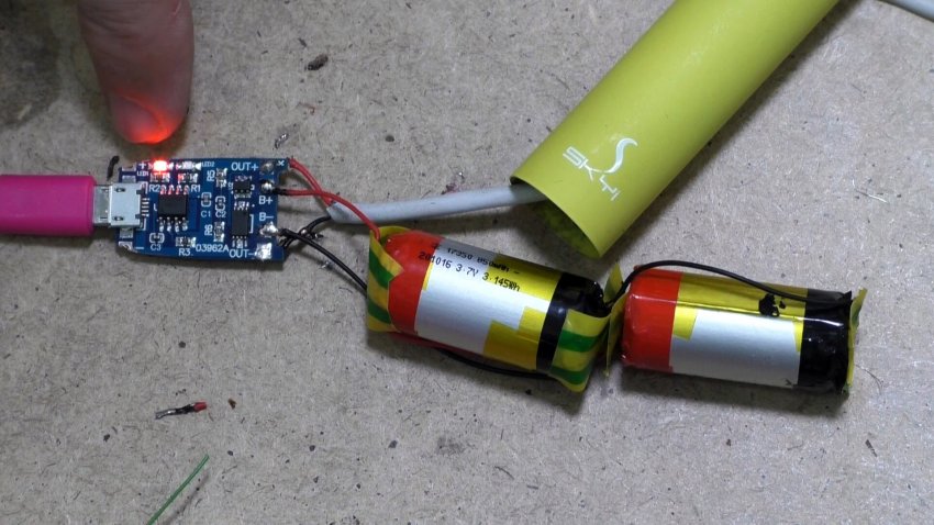 А теперь проверка. Подключаем зарядное устройство к разъёму, который у нас расположен в бывшем мундштуке. Загорелся красный светодиод – зарядка пошла. Когда напряжение батарей достигнет порога в 4,2 Вольта, загорится синий светодиод и зарядка прекратится. Так работает контроллер заряда-разряда. Ну, и подключим наш пауэрбанк к телефону. Что мы видим? Телефон показывает, что он заряжается. Всё работает.