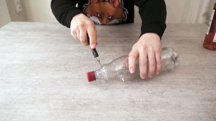 Оставляем под крышкой ПЭТ-бутылки по высоте примерно 2-3 см горлышка и удаляем остальную часть с помощью острого канцелярского ножа. Затем открываем традиционным способом с помощью штопора винную бутылку и удаляем корковую пробку.