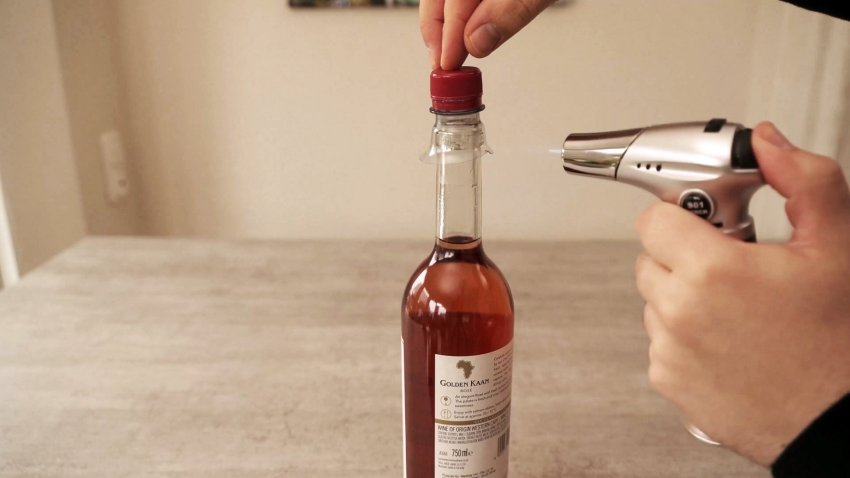 Убеждаемся в том, что крышка ПЭТ-бутылки в точности подходит к горлышку винной бутылки из стекла. Теперь пламенем газовой горелки осторожно и равномерно нагреваем часть горлышка ПЭТ-бутылки по кругу.