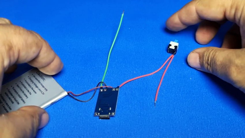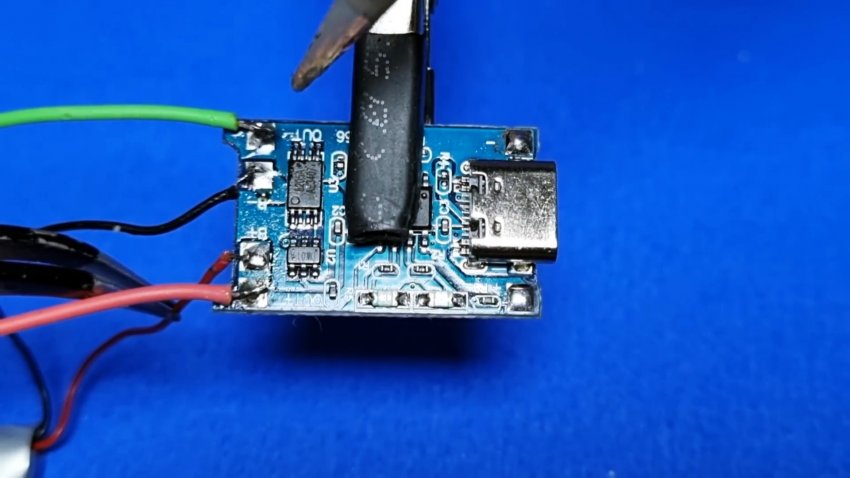 Абсолютно все точки подключения подписаны на платах. Очень сложно ошибиться. Припаиваем к зарядному модулю провода выхода питания (out+/out-) и аккумуляторной батареи (В+/В-).