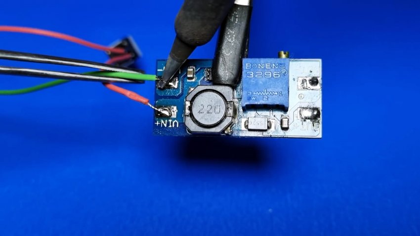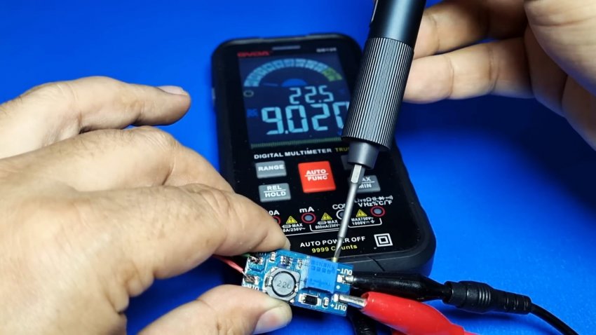 Регулировка выходного напряжения осуществляется прецизионным многооборотным потенциометром. Распаиваем провода согласно надписям на печатной плате. Включаем наше собранное устройство и выставляем выходное напряжение 9 В.