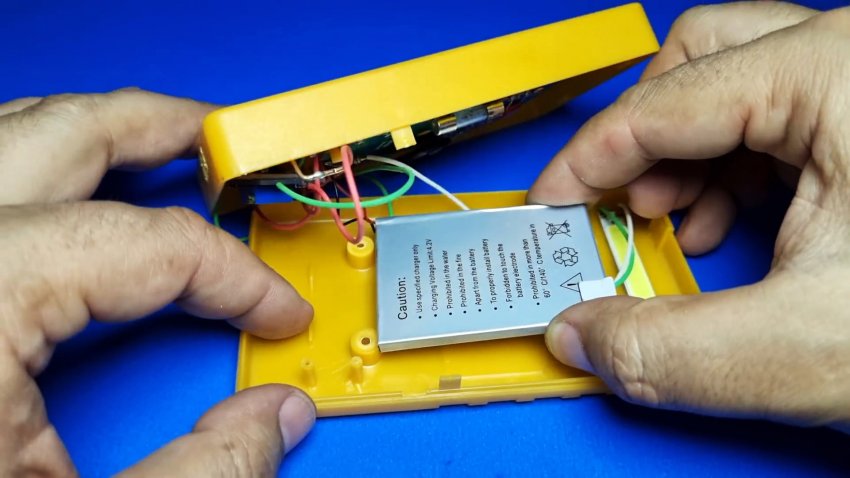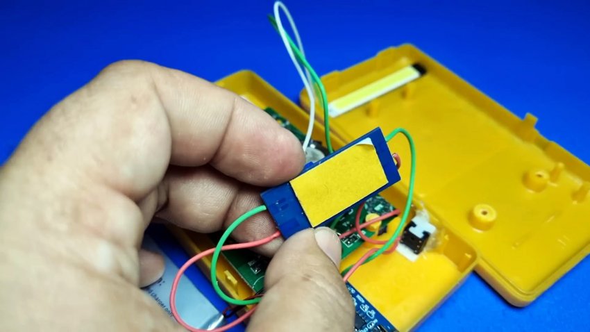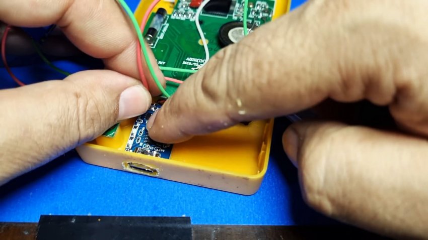 В этом нам помогает двусторонний скотч и термоклей. Следим, чтобы ничего не замкнуть, при необходимости подкладываем изоляционную ленту. Закрываем мультиметр. Проверка.
