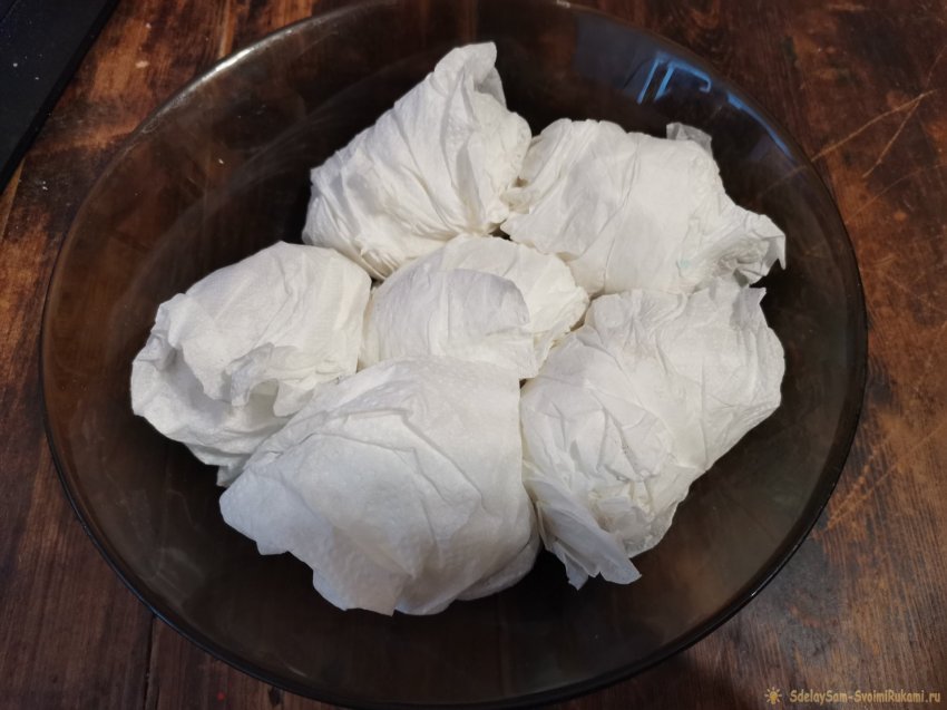 Заранее отварите яйца до готовности (вкрутую). Можно работать с горячим продуктом или его остудить. Обмотайте каждое яйцо бумажными салфетками или полотенцами. Необязательно делать это аккуратно, можете даже специально сминать бумагу.