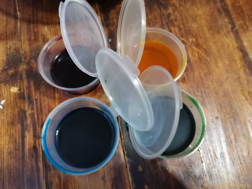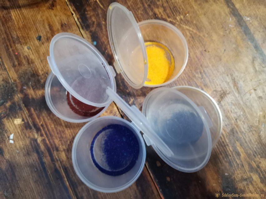 В отдельные емкости насыпьте пищевой краситель. У меня было четыре основных цвета из набора – желтый, красный, синий и зеленый.