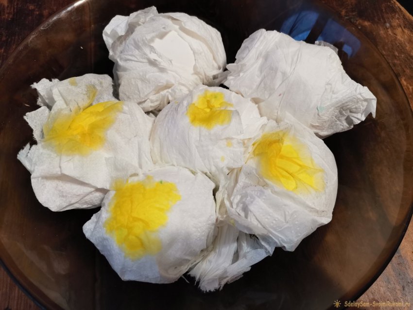 Ватную палочку обмокните в цветной раствор и в некоторых местах, в хаотичном порядке, покрасьте салфетки. Начинайте с более светлого цвета – у меня это желтый.