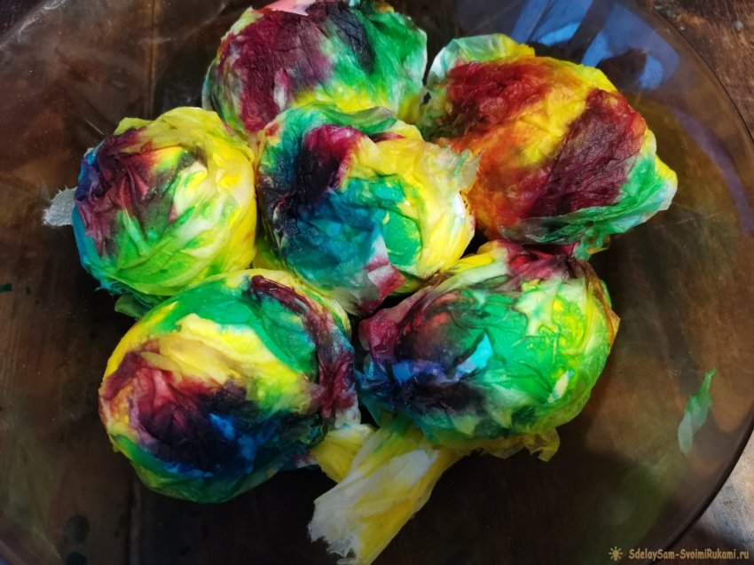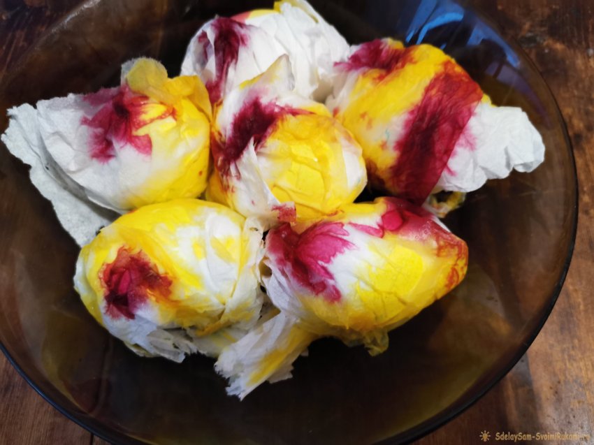 Оставьте яйца в цветных салфетках на 20-30 минут. Можете иногда добавлять краску. Через положенное время снимите бумагу, протрите каждую штучку растительным маслом для закрепления цвета и появления блеска. Разложите на ровной поверхности для высыхания.
