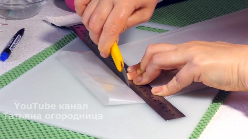 Для этого, уравнивая срезы пленки, несколько раз ее складываем, затем прикладываем полоску бумаги, фиксируем линейкой и по ней отрезаем все лишнее ножом.