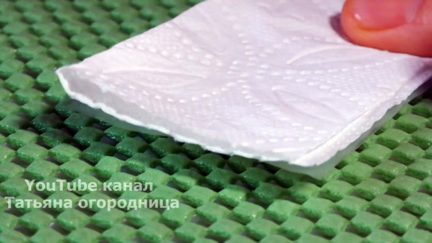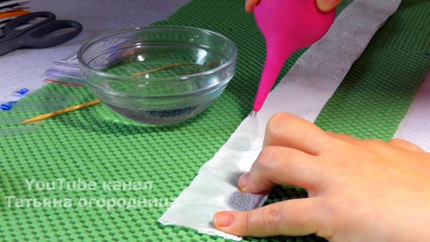 Для посева понадобятся неширокие полоски полиэтилена, вырезанные из всевозможных остатков или пакетов из-под молочных продуктов, ровно подрезаемых по рисунку. Также нужна туалетная бумага, лучше отрывная и без красителей, т. е. белая.