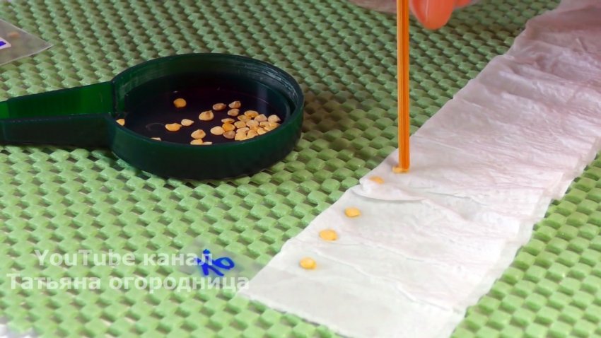 В начале полосы устанавливаем разделитель с №16. Семена из соответствующего пакета высыпаем в специальную сеялку. Семена из нее переносим на влажную туалетную бумагу деревянной шпажкой, конец которой смачиваем водой. Выбираем семена посветлее и покрупнее.