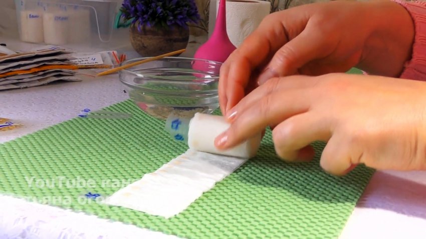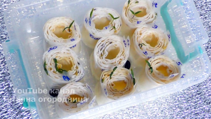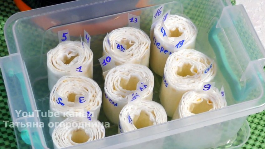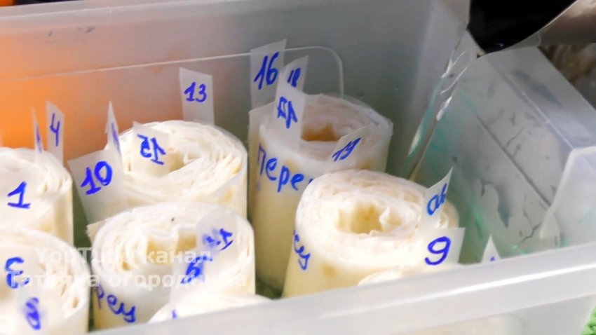 Верхнюю бумагу опять проливаем водой и пальцами слегка прижимаем к основанию. Затем полоску сворачиваем в рулон, начиная с конца к началу, чтобы все номера шли по порядку. Вверху на рулоне надписываем наименование посеянной культуры и помещаем его в пластиковый контейнер с остальными рулонами.