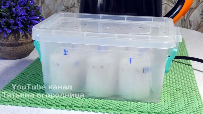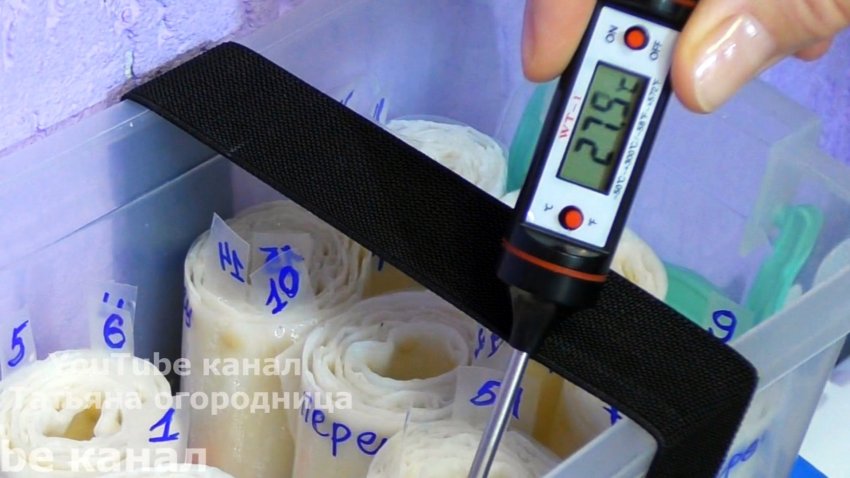 В контейнер заливаем крутой кипяток в таком объеме, чтобы после того, как бумага в рулонах его немного впитает, на дне контейнера все еще оставалось кипятка на 1-2 см. Быстро закрываем крышку контейнера, чтобы семена подверглись действию горячего пара, и не снимаем ее до полного остывания воды. После чего семенам перца и баклажанов нужно обеспечить благоприятную температуру, составляющую 25-28 градусов Цельсия.
