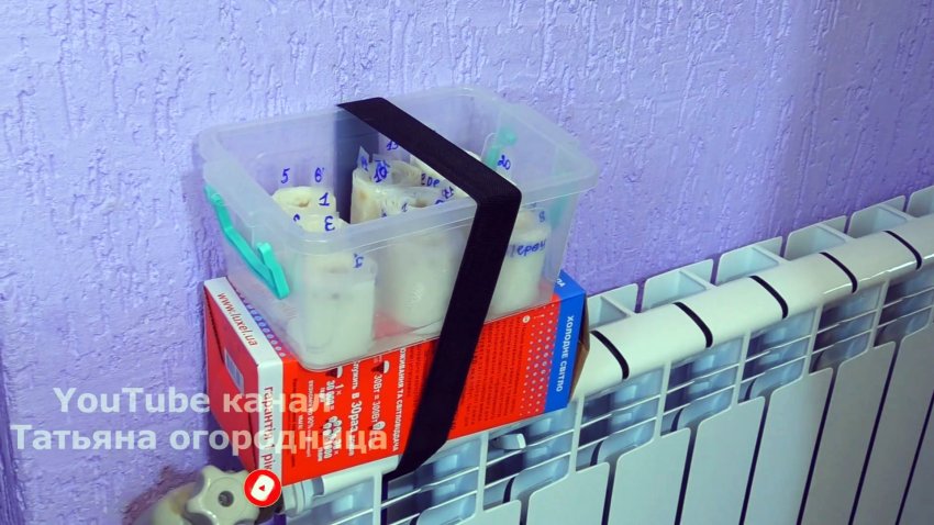Следует между батареей и контейнером поместить пустую картонную коробку и прижать их резиновым кольцом, пропущенным через отверстия в батарее. Крышку контейнера держим закрытой, но в течение дня 1-2 раза проветриваем по 15-20 минут.