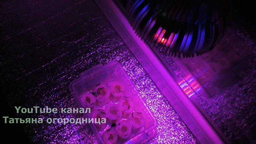 Значит наступило время переноса контейнера с батареи отопления на подоконник и установки биколорной лампы для освещения растений не менее 12 часов в сутки. Также заменяем воду на свежую, а чтобы она не застаивалась, добавляем 2 таблетки активированного угля для подавления развитие различной патогенной микрофлоры и защиты корешков всходов от загнивания.