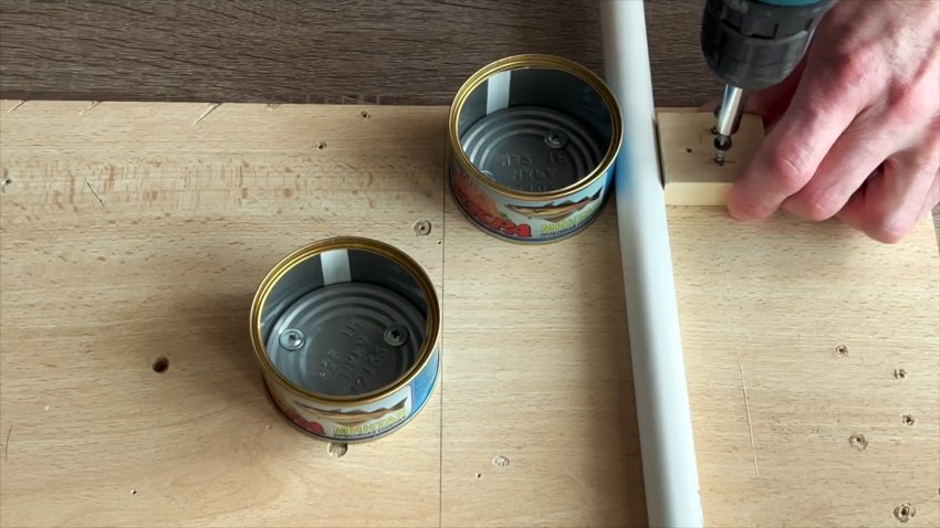 На листе многослойной фанеры или ДСП проводим прямую линию и крепим одну консервную банку так, чтобы она касалась линии. Вторую банку аналогично располагаем с другой стороны линии.