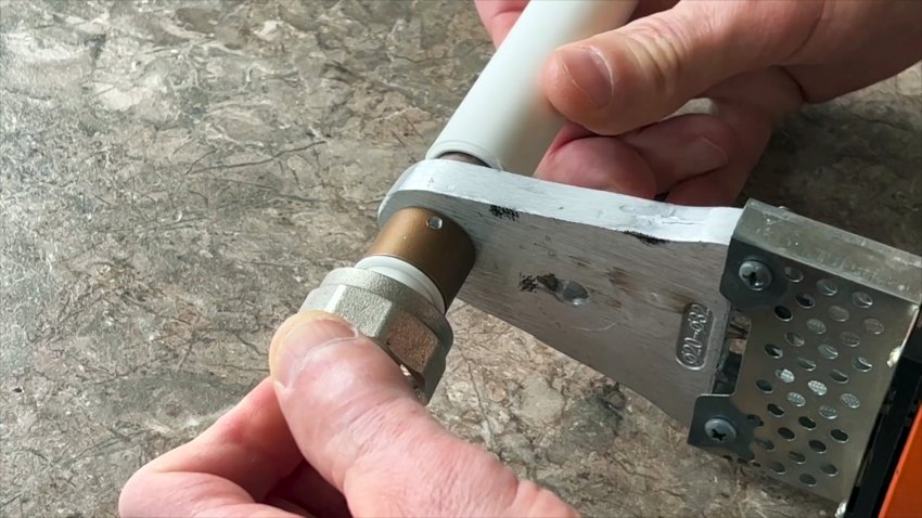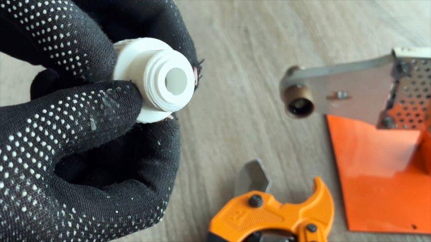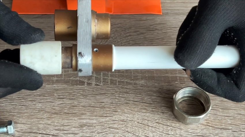 С помощью аппарата для сварки пластиковых труб соединяем пластиковую трубу с муфтой, наружный диаметр которой заведомо больше диаметра трубы. С учетом высоты накидной гайки отрезаем ножовкой большую часть муфты, а остаток будет служить буртиком, которым накидная гайка будет плотно прижимать трубу к соединяемому фитингу или аппарату.